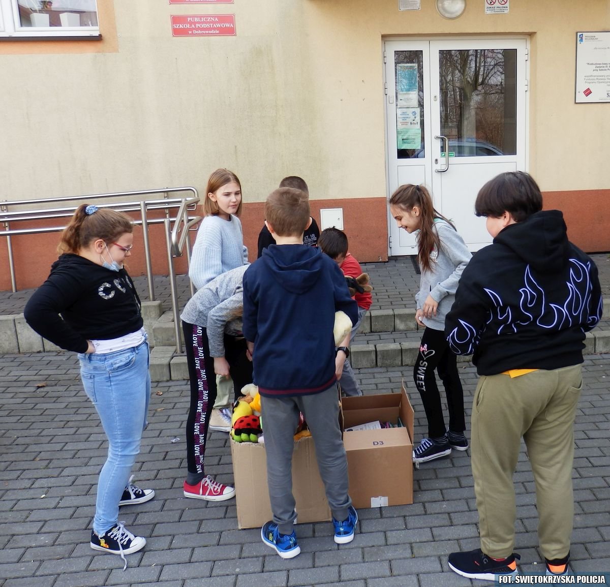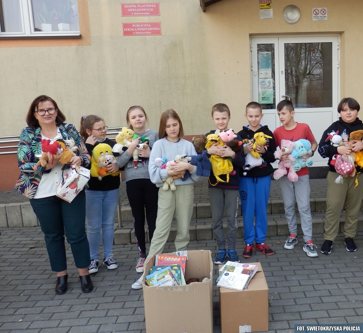 Maskotki zebrane przez dzieci ze szkoły w Dobrowodzie -