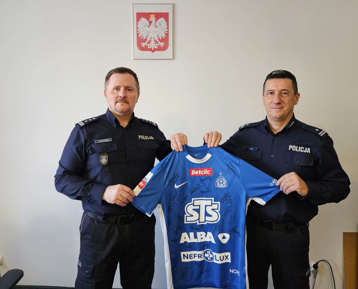 Komendant Powiatowy Policji w Busku – Zdroju insp. Andrzej Skowroński oraz Pierwszy Zastępca podinsp. Rafał Kulasek przekazali na aukcję wyjątkową koszulkę z podpisami piłkarzy pierwszej drużyny Ruchu Chorzów. Może się ona stać własnością każdej osoby, która weźmie udział w licytacji podczas 34. Finału Wielkiej Orkiestry Świątecznej Pomocy. Środki uzyskane ze sprzedaży tej wyjątkowej rzeczy, zasilą konto fundacji. Jest to koszulka 14 – krotnego Mistrza Polski. Drużyna aktualnie rywalizuje z 1 lidze. W takich koszulkach zawodnicy na co dzień występują w meczach ligowych. Koszulka została przekazana buskim policjantom przez klub w podziękowaniu za zabezpieczenie pobytu drużyny na obozie przygotowawczym w Busku – Zdroju. Zachęcamy do wzięcia udziału w tej szczytnej aukcji.